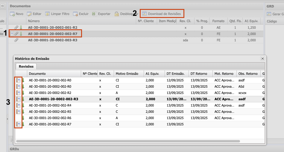 - No momento da emissão de um documento na GRD, o usuário de planejamento terá disponível o ícone de download da cópia de verificação, quando existente.